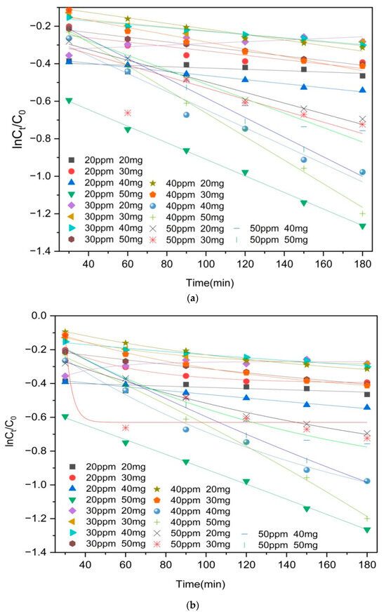 Pseudo-first-order kinetic model of moxifloxacin adsorption by Co/Cd-MOF carbon materials ((a). linear; (b). nonlinear).