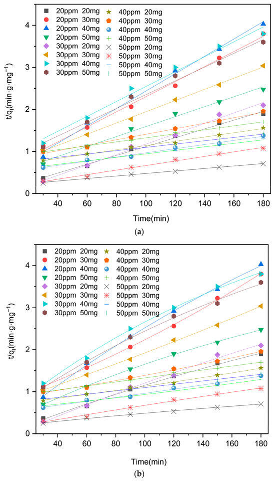 Pseudo-second-order kinetic model of moxifloxacin adsorption by Co/Cd-MOF carbon materials ((a). linear; (b). nonlinear).