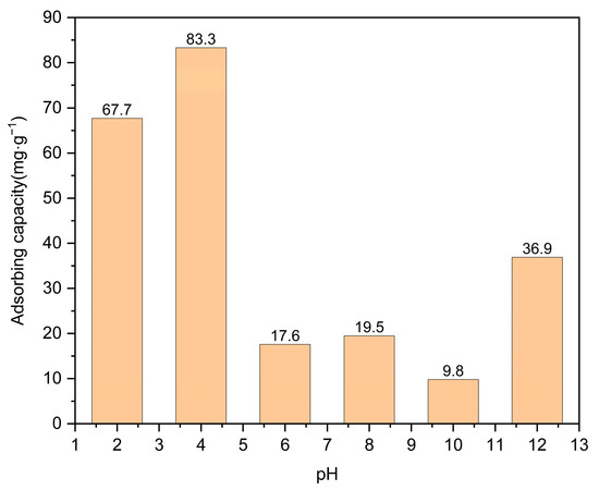 To investigate the influence of solution pH on moxifloxacin adsorption, a 50 ppm moxifloxacin solution at pH levels ranging from 2 to 12 was introduced to Co/Cd-MOF-incorporated carbonized materials with a mass of 20 mg. After three hours of stirring, the results presented in Figure 10 revealed that optimal moxifloxacin adsorption occurred at pH 4, primarily attributed to charge effects resulting in enhanced substance adsorption per unit mass or volume.