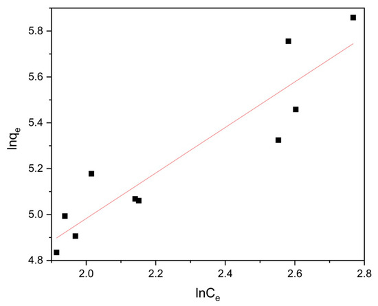 To validate the experimental findings regarding moxifloxacin adsorption by Co/Cd-MOF carbon materials, we employed the Langmuir and Freundlich isotherm models to analyze the collected data (refer to Figure 11 and Figure 12 and Table 3). The obtained R2 values for the Langmuir and Freundlich models were 0.1247 and 0.8361, respectively. Importantly, the Freundlich model exhibited superior agreement with the actual moxifloxacin adsorption process, suggesting a multilayer adsorption mechanism for moxifloxacin on Co/Cd-MOF carbon materials.