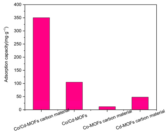 A comparison of experimental results often necessitates evaluating them in relation to other adsorbents. Table 4 presents the adsorption capacities of various adsorbents for moxifloxacin, revealing that the Co/Cd-MOF carbon material demonstrates superior efficacy in adsorbing moxifloxacin. Chai et al. employed chromic nitrate hydrate and terephthalic acid to synthesize MIL-101, achieving a moxifloxacin adsorption capacity of 86 mg/g at 220 °C. In contrast, Zhao et al. utilized ZrOCl2·8H2O and H3BTC to prepare MOF-808-AA and MOF-808-SIPA, resulting in significantly higher moxifloxacin adsorption capacities of 174.6 mg/g and 287.1 mg/g [40,41], respectively. The variation in adsorption amounts can be attributed to the distinct metal–ligand structures formed by different metal ions.