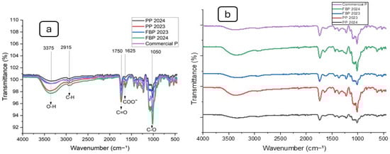 FTIR was employed to identify the functional groups of the pectin. Figure 1 illustrates that FBP 2024, PP 2024, PP 2023, FBP 2023, and Commercial P all exhibited the characteristic absorption peak of polysaccharides. The FTIR spectra profiles of these five samples were nearly identical. Significant absorption near 3375 cm−1 was attributed to stretching of the hydroxyl groups. The absorption at 2915 cm−1 was attributed to C–H stretching of the CH2 groups from the methyl and methylene groups of polysaccharides. Absorption at 1750 cm−1 was due to C=O stretching vibration of the methyl-esterified carboxyl groups. Absorption at 1625 cm−1 was caused by C=O stretching vibration of the ionic carboxyl groups in the pectin, and lastly, the C-O stretch at 1050 cm−1 corresponded to β-glycosidic linkages [43].