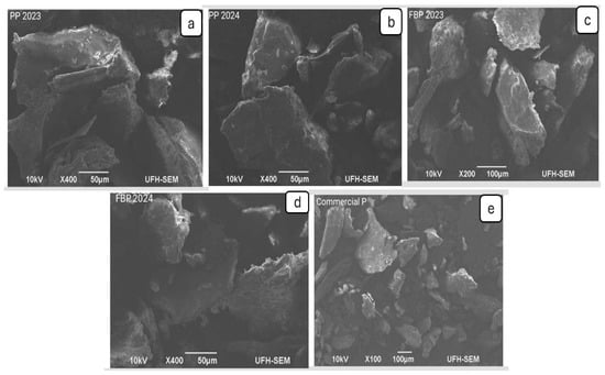 Figure 2 shows the SEM images of four extracted pectin samples: PP 2023 (a), PP 2024 (b), FBP 2023 (c), and FBP 2024 (d), as well as commercial pectin (e). In the SEM images of the pectin particles, size differences significantly influenced the structural characteristics and potential applications of the pectin. The small pectin particles of the commercial pectin displayed a smooth surface morphology with a consistent size and shape. These smaller particles are likely to disperse more readily in solutions, resulting in improved solubility and interactions with other food components. Also, this feature indicates a high surface area, which is beneficial for rapid hydration or binding applications [43,44].