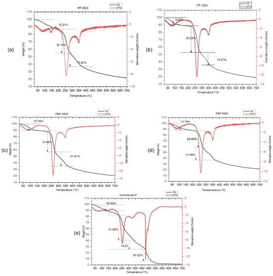 The thermal decomposition behavior of various pectin samples was analyzed through TGA. The thermal stability of pectin is crucial for its application in drug delivery. TGA analysis revealed the temperature ranges where the pectin maintained stability, ensuring its safe use in pharmaceutical formulations, as shown in Figure 3. The results showed distinct stages of decomposition for each sample. All four extracted pectin samples (PP 2023, PP 2024, FBP 2023, and FBP 2024) had three-step degradation. Initially, weight loss was observed at approximately 80–90 °C, indicating the evaporation of moisture or volatile components [46]. This was followed by significant weight loss at temperatures ranging from 250 to 350 °C, which could be attributed to the breakdown of pectin molecules or the release of organic compounds [47,48]. Finally, the last decomposition stage occurred at temperatures above 350 °C [49]. Table 3 summarizes these three-step degradation processes with their corresponding temperatures. However, commercial pectin had four-step degradation process. At 80.37 °C, the initial decomposition of Commercial P resulted in 10.05% weight loss, corresponding to the evaporation of moisture or volatile impurities. At 254.15 °C, the second decomposition stage was linked to the breakdown of pectin molecules or the release of organic compounds, resulting in a significant loss of 41.26%. At 328.43 °C, the third decomposition stage indicated further degradation of organic matter, with weight loss of 15.07%. At 427.79 °C, the final decomposition stage led to a 20.22% weight loss, suggesting complete degradation of the remaining organic components in the pectin sample.