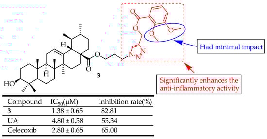 Zhang et al. [60] designed and synthesized three compounds by attaching 1,2,3-triazole groups to UA to explore new anti-inflammatory agents. These compounds were evaluated for anti-inflammatory effects employing an ear edema model. The most potent compound was subjected to in vitro assays for COX-2/ COX-1 inhibition. Overall, the derivatives demonstrated significant anti-inflammatory activity. Notably, compound 3 (Figure 3) showed the highest activity, with an 82.81% inhibition rate following intraperitoneal administration, surpassing celecoxib used as a positive control. Molecular docking revealed the interaction mechanism between the COX-2 enzyme and compound 3. Further studies indicated that compound 3 had strong COX-2 inhibitory activity, with an IC50 value of 1.16 µM and a selectivity index (SI) of 64.66, comparable to celecoxib with an IC50 value of 0.93 µM and SI of 65.47. These findings show that this chemotype holds promise for developing new anti-inflammatory agents targeting COX-2. It was observed that the position and the physical and chemical properties of different substituents on the phenyl ring had little effect on the anti-inflammatory activities of these compounds. This suggests that the electronic effect of the group attached to the benzene ring was insignificant.