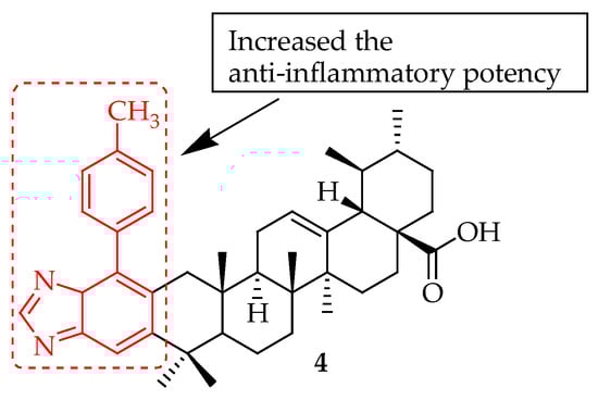 The same authors [61] synthesized and screened two series of novel UA-based 1,2,4-triazolo [1,5-a]pyrimidine derivatives for their anti-inflammatory properties. They evaluated the compounds by examining how these compounds inhibit the inflammatory response induced by LPS in RAW 264.7 macrophages in vitro. The researchers examined how varying concentrations of the compounds affected the release of nitric oxide (NO) and inflammatory cytokines (i.e., TNF-α and IL-6). They also assessed the compounds’ in vitro toxicity. The findings showed that compound 4 (Figure 4) could significantly decrease the production of the inflammatory factors. A docking analysis was performed to explore how compound 4, UA, and Celecoxib interact with the active site of the COX-2 receptor. The enzyme study conducted in vitro indicated that compound 4 achieves its anti-inflammatory effects by inhibiting COX-2. This research illustrated that incorporating a 1,2,4-triazolo[1,5-a]pyrimidine group into UA unexpectedly increased the anti-inflammatory potency of its derivatives. Previous research [20] showed a significant enhancement in the anti-inflammatory effect of UA by not modifying the carboxylic acid group (C-28). This study similarly found that certain compounds demonstrated more potent inhibition of IL-6 compared to compounds with an ethyl group added at the C-28 position.