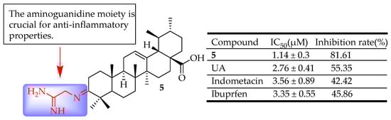 Wu and colleagues [62] designed, synthesized, and evaluated three sets of UA derivatives that incorporated an aminoguanidine moiety for their antibacterial and anti-inflammatory properties. The anti-inflammatory tests revealed that a majority of the compounds demonstrated strong activity. Notably, compound 5 (Figure 5) showed the highest potency, achieving 81.61% inhibition following intraperitoneal administration. This was more effective than UA and the standard reference drugs ibuprofen and indomethacin. SAR analysis demonstrated that the aminoguanidine group was crucial for anti-inflammatory properties. These findings suggested that keeping the carboxylic group (C-28) was advantageous for maintaining this activity.