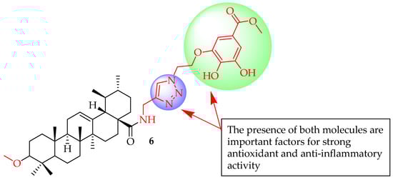 Qi et al. [63] conducted a study in which they synthesized 16 new hybrids of UA. These hybrids were linked through 1,2,3-triazole to modified gallate moieties, employing CuAAC 1,3-cycloaddition reactions. In the in vitro tests, it was shown that all these derivatives were successful in reducing oxidative stress and inflammation. Significantly, compound 6 (Figure 6) effectively reduced the expression of pro-inflammatory cytokines in lipopolysaccharide (LPS)-induced RAW264.7 cells in a dose-dependent manner, notably suppressing mRNA levels of iNOS (p < 0.05) and COX-2 (p < 0.01). Compound 6’s ability to inhibit pro-inflammatory cytokines was associated with its suppression of the LPS-induced PI3K/Akt signalling pathway. Additionally, in vivo studies using zebrafish demonstrated that compound 6 effectively reduced inflammation in the gastrointestinal tract and exhibited favourable safety profiles in cytotoxicity assessments. According to their analysis of SARS, they noted that the potent anti-inflammatory effects of these new compounds could be explained by several factors: (1) the incorporation of triazole and gallate groups as polar components along with a nonpolar triterpene structure create hybrid compounds, possessing amphiphilic properties. This improves the solubility and availability of the hybrid derivatives; (2) the strong anti-inflammatory potency of hybrid triterpene derivatives containing a triazole linker is linked to the existence of two adjacent polar substituents in the aromatic position, consistent with the research findings of Zhang et al. [62]; (3) incorporating a gallate component into the hybrid compound led to remarkable antioxidant properties, potentially accountable for the inhibition of ROS; and (4) the incorporation of shielded gallates featuring a methoxy-methylenedioxy component enhanced the antioxidant and anti-inflammatory activities. Compounds containing this methoxymethylenedioxy segment could be seen as a latent form, combining polyphenol and aldehyde attributes. Reports suggest that integrating 1,3-benzodioxole components can enhance a compound’s antioxidant, hypolipidemic effect, and anti-inflammatory (i.e., COX-2 inhibition) [64,65] properties. Hence, hybrids featuring 1,3-dioxo-lane protection may outperform derivatives with unbound phenolic OH groups in terms of antioxidant activity. The amide or ester linkage between the C-28 position of UA and the linker, along with the ether connection between the linker and the gallate element, exhibits resistance to hydrolysis, ensuring the stability of hybrid derivatives. This study offered a new reference for developing molecules for health issues related to antioxidation and anti-inflammation properties.