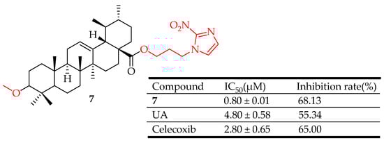 UA derivative 7 and its anti-inflammatory outcomes compared to UA and Celecoxib.