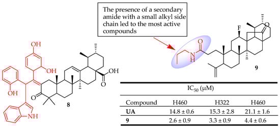 Fan et al. synthesized twelve novel UA-based hybrid compounds and evaluated them against glioma cell lines. Among the synthesized compounds, compound 8 (Figure 8) exhibited stronger inhibition of U251 cell proliferation compared to UA. Compound 8 suppressed the growth of glioma cells, triggered apoptosis, and halted cell cycle progression by down-regulating metabolic pathways [81]. Mendes et al. [82] prepared a collection of novel ring-A cleaved UA derivatives and evaluated their impact on inhibiting proliferation in non-small cell lung cancer (NSCLC) cells using both 3D and 2D culture models. The most effective compound was found to be compound 9 (Figure 8) with a secondary amine at position C-3 of a cleaved ring-A. Among the amide derivatives, those with secondary amides and bulkier side chains exhibited a significant reduction in cytotoxic activity. In contrast, secondary amides with smaller alkyl side chains resulted in the most potent compounds, with compound 9 demonstrating five times greater potency than the parent compound UA across all tested cell lines. The molecular mechanism investigation of this compound indicated the promotion of apoptosis via the activation of caspase-7/-8, along with the suppression of Bcl-2. Compound 9 also induced autophagy with elevated levels of Beclin-1 or LC3A/B-II and reduced levels of mTOR and p62.