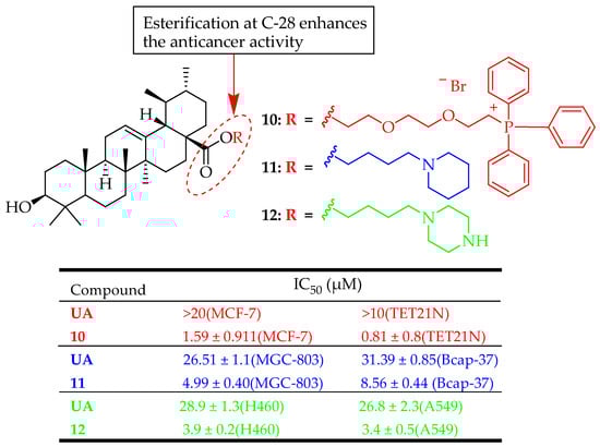 Liu et al. assessed the in vitro anticancer effects of compound 11 (Figure 9) on human breast cancer cells (Bcap-37) and gastric cancer cells (MGC-803) using an MTT assay. Compound 11 demonstrated a more potent inhibitory effect than UA. The mechanism of compound 11 was studied by Hoechst 33258 staining, acridine orange/ethidium bromide staining, terminal deoxynucleotidyl transferase biotin-dUTP nick-end labelling assay, and flow cytometry, which indicated that compound 11 can initiate apoptosis in MGC-803 cells, achieving an apoptosis rate of 34.59% after 36 h of treatment with 10 μM concentration [84]. The results indicate that: (1) Substituting the C28-COOH group of UA with a fatty alkyl group significantly reduced its effectiveness. (2) A notable improvement in cell growth inhibition was observed when an amino group was introduced at the C28 position. (3) Esterification of the C3-OH and C28-COOH groups with succinic anhydride and benzyl bromide, respectively, significantly enhanced the biological activity. However, introducing aromatic amines at the C-3 position resulted in a loss of activity, highlighting the importance of maintaining a polar group at the C-3 position for cytotoxic activity.