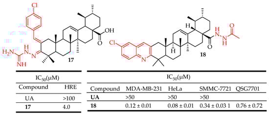 Wu et al. reported that UA derivative 17 (Figure 11) bearing an aminoguanidine moiety possesses the ability to inhibit HIF-1α transcriptional activity in low-oxygen conditions with an IC50 value of 4.0 µM. Compound 17 decreased HIF-1α protein expression by inhibiting its synthesis, lowered vascular endothelial growth factor production, and impeded cancer cell proliferation [38]. Compound 18 (Figure 11) synthesized by Jin et al. exhibited the most potent activity against three cancer cells (SMMC-7721, HeLa, and MDA-MB-231) and induced the apoptosis of cervical cancer cells (HeLa cells), halted cell cycle progression at the G0/G1 phase, decreased mitochondrial membrane potential, and elevated intracellular reactive oxygen species levels. Moreover, it suppressed MEK1 kinase activity and disrupted the Ras/Raf/MEK/ERK-signaling pathways [87].
