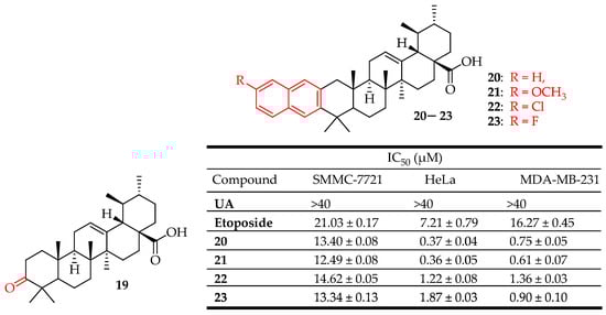 Gu et al. synthesized compounds 20–23 (Figure 12), which exhibited significant antitumor activities against three different human cancer cell lines (HeLa, SMMC-7721, MDA-MB-231), demonstrating greater potency than the positive control, etoposide. Compounds 20–23 were synthesized by dissolving UA in acetone and oxidizing it with Jones reagent, resulting in a 75% yield of 3-oxo-ursolic acid (19). Compound 19 was then treated with the respective o-amino benzaldehyde under a nitrogen atmosphere to produce compounds 20–23, with yields ranging from 62% to 68%. Compound 21 induced apoptosis in MDA-MB-231 cell lines in a dose-dependent manner. Additionally, cell cycle analysis showed that compound 21 promoted G0/G1 phase arrest in MDA-MB-231 cell lines [88].