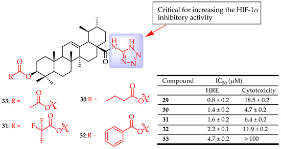 Zhang et al. developed a series of new UA containing tetrazole derivatives and assessed their inhibitory activity on the hypoxia-inducible factor 1α (HIF-1α), migration, angiogenesis, and proliferation. The most potent compounds were 29 (IC50 = 0.8 µM), 30 (IC50 = 1.4 µM), 31 (IC50 = 1.6 µM), 32 (IC50 = 2.2 µM), and 33 (IC50 = 4.7 µM) (Figure 15). Of the compounds tested, compound 33 showed the most promising HIF-1α inhibitory activity and did not show any significant cytotoxicity at a concentration of 30 µM against a Hep3B cell line. Analysis of the SARs of the compounds showed an increase in the HIF-1α inhibitory effect upon introducing a tetrazole moiety at C-28 of UA while bulky groups at C-3 proved to decrease the HIF-1α inhibitory activity [39].