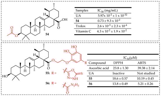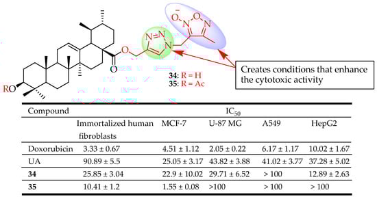 Popov et al. synthesized novel UA derivatives with a combination of two different azole types (1,3,4-oxadiazole and 1,2,3-triazole or 1,2,5-oxadiazole and 1,2,3-triazole) at different positions of UA. These hybrid compounds were evaluated for their cytotoxicity against immortalized human fibroblasts, A549, U-87 MG, HepG2, and MCF-7 cell lines. Compounds 34 and 35 (Figure 16) showed cytotoxicity comparable to that of UA on MCF-7 cells. Compound 35 had a 3-O-acetyl group which is known to have the potential of enhancing cytotoxicity [90]. Though 35 was less active than UA against the three cell lines, it exhibited excellent cytotoxicity against MCF-7 cells with IC50 = 1.55 µM, even better than doxorubicin (IC50 = 4.51 µM). Linking heterocyclic fragments of 1,2,3-triazole and 3-(methyl)-4-methyl-1,2,5-oxadiazole-2-oxide to the C-28 position of UA creates a favorable condition for the cytotoxic activity of these hybrid derivatives [91].