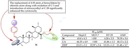 Zhang et al. synthesized a series of NO-donating UA-benzylidine derivatives and evaluated their in vitro antitumor activity against four human cancer cell lines (HepG-2, MCF-7, HT-29, and A549). The different constituents of the benzylidene at C-2 resulted in different inhibitory activity. Compound 36 (Figure 17) was found to be the most promising candidate with IC50 values of 65.8, 4.28, and 78.39 µM on HepG2, HT-29, and A549 cells, respectively. The cytotoxicity of 36 against these different cancer cell lines was attributed to replacing the 4-H atom at benzylidene with chlorine, introducing nitrooxyethyl at C-28, and the oxidation of C-3. Compound 36 induced apoptosis via arrest of the cycle at the G1 phase and mitochondria-mediated pathway. The very low IC50 (4.28 μM) of compound 36 against HT-29 showed its potential application for the treatment of colon cancer [92].
