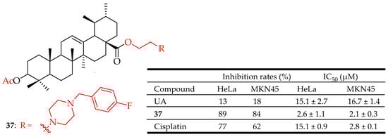 UA derivative (37) and its anticancer outcomes compared to UA Cisplatin.