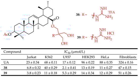 Spivak et al. evaluated the anticancer properties of their novel C-28 guanidine-functionalized UA-based derivatives. Compounds 38 and 39 (Figure 19) exhibited better anticancer activity than UA when tested against HeLa, Jurkat, Hek293, K562, and U937 cell lines. Although compound 39 showed a weaker apoptotic effect, especially on the Jurkat cell line, it showed comparable results in decreasing the number of vital Jurkat cells (6.8, 14.3, and 20.7% of early and late apoptotic cells and necrotic cells, respectively). Based on the biological evaluation, compound 39 is assumed to trigger programmed cell death, which includes apoptotic mechanisms and arresting of the cell cycle in the S-phase [94].