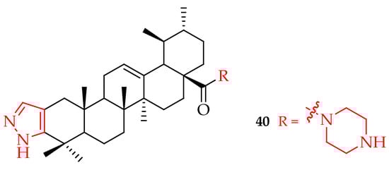 Li et al. developed a novel UA derivative, having a nitrogen heterocyclic scaffold, which suppressed cell proliferation and triggered apoptosis in breast cancer cell lines. IC50 values for suppression of SUM149PT and HCC1937 cell viability by compound 40 (Figure 20) were 4–6 μM compared to 8-10 μM by UA on the same cell lines. Compound 40 arrested the G0/G1 cell cycle, thereby inducing suppression of cancer cell viability. Treatment of SUM149PT and HCC1937 cells with 5 μM of 40 and UA revealed that the ability of 40 to induce apoptosis was higher than that of UA. The results showed that the incorporation of piperazine and thiourea at the C-28 and C-3 positions of UA significantly inhibits breast cancer cell viability [95].
