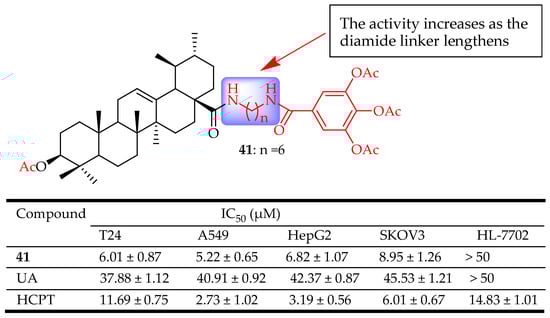 Jiang et al. synthesized a series of UA derivatives having long-chain diamine gallic acid moieties as potential NF-κB inhibitors. Compound 41 (Figure 21) had the best activity against the four cell lines. The C-3 carbonyl moiety on compound 41 interacted with key residues on NF-κB through hydrogen bonding, thereby inhibiting its activity. Compound 41 inhibited the binding of NF-κB to DNA, suppressed NF-κB activation, inhibited A549 cell migration in vitro, and arrested A549 cell line at the G1 phase. The results showed the potential of the UA derivatives in inhibiting the NF-κB pathway, thus being able to suppress migration and reverse MDR in A549 lung cancer cells [36]. The SAR study reveals that diamide linkers at the C-28 position play an important role in the biological activity of the compound. Comparing the inhibitory concentrations of the pairs (with similar substitution and variation in n) indicated that the longer diamide side chain (n = 6) showed relatively enhanced activity than the shorter diamide side chain (n = 4 and 5).