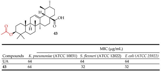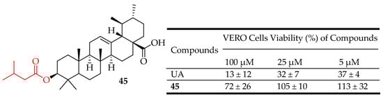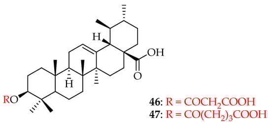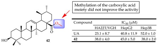 Fontana et al. evaluated the involvement of NF-κB in the cytotoxicity of UA derivatives towards the cell lines HepG2, Hep3B, and HA22T/VGH of hepatocellular carcinoma. Methylation of the carboxylic acid moiety did not improve the activity of the compounds while oxidation of C-3 resulted in the loss of activity. Compound 42 (Figure 22) showed inhibitory effects on NF-κB comparable to the ones of UA against the selected cell lines, showing its potent cytotoxicity towards hepatocellular carcinoma [33].