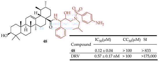 - Zhu, M.; Du, X.N.; Li, Y.G.; Zhang, G.N.; Wang, J.X.; Wang, Y.C. Design, Synthesis and Biological Evaluation of Novel HIV-1 Protease Inhibitors with Pentacyclic Triterpenoids as P2-Ligands. Bioorg. Med. Chem. Lett. 2019, 29, 357–361. [Google Scholar] [CrossRef]
