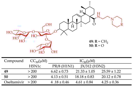 - Li, H.; Li, Z.; Wang, H.; Luo, Z.; Zhang, L.; Zhou, D. Incorporation of Privileged Structures into 3-O-β-Chacotriosyl Ursolic Acid Can Enhance Inhibiting the Entry of the H5N1 Virus. Bioorg. Med. Chem. Lett. 2019, 29, 2675–2680. [Google Scholar] [CrossRef] [PubMed]