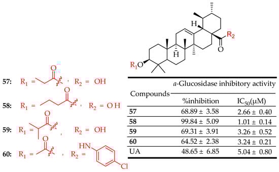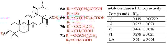 Meng et al. designed and synthesized eighteen UA derivatives and evaluated their cytotoxicity in vitro against two cancer cell lines, namely BEL7402 and SGC7901, by MTT assay. Four compounds (i.e., 13, 14, 15 and 16 (Figure 10)) showed a significantly higher inhibitory rate than the parent UA on both cell lines, and the interactions between the four compounds and NF-κB were also studied by docking simulations [86].