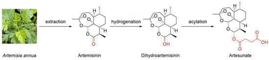 Dihydroartemisinin is a typical semisynthetic derivative of artemisinin with the lactone ring modified into a hydroxyl group through mild hydrogenation (Figure 1) [9]. Furthermore, artesunate is another commonly used artemisinin derivative that is obtained by the acylation of dihydroartemisinin with succinic anhydride under basic conditions (Figure 1) [10]. Because of the introduction of hydrophilic groups in the modification process, the solubilities of dihydroartemisinin and artesunate are improved. Furthermore, pharmacokinetics analysis has suggested that artesunate can be rapidly hydrolyzed into dihydroartemisinin under physiological conditions [11]. In a clinical trial, the apparent elimination clearance of dihydroartemisinin increased by 24.9% with the increasing treatment time of artesunate, indicating the autoinduction of metabolism [12]. Dihydroartemisinin and artesunate are the most representative derivatives of artemisinin and are commonly used as substitutes for artemisinin.