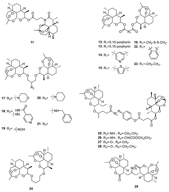 Unlike the above artemisinin-derived dimers connected by oxygen atoms, Kalen et al. synthesized a novel artemisinin-derived carba-dimer 29 (Figure 3) through a selenoxide elimination method. Anticancer effect determination showed that 29 had better anti-proliferative effects on human head–neck (Cal27), breast (MDA-MB-231), prostate (PC-3), and melanoma (A375 and MD-435) cancer cell lines than artemisinin, and it could lead to oxidative stress and cell cycle G1 arrest of cancer cells [95].