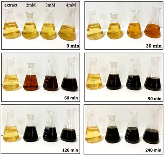 Figure 1 and Figure 2 demonstrate how varying the concentration of AgNO3 and the pH of the extract altered the formation rates of the AgNPs, where a quicker color change from yellow to black indicates an increased reaction rate. The formation of AgNPs took place within 60–90 min for different concentrations of AgNO3 (Figure 1) and within ~30 min at the higher pH values of the extract (Figure 2); the increase in the formation rate was observed with the increase in the concentration of AgNO3 and the pH of the extract.