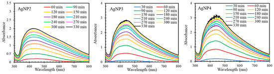 The AgNP surface plasmon resonance curves during the synthesis with 2, 3, and 4 mM AgNO3 and a pH of the extract of 4.5.