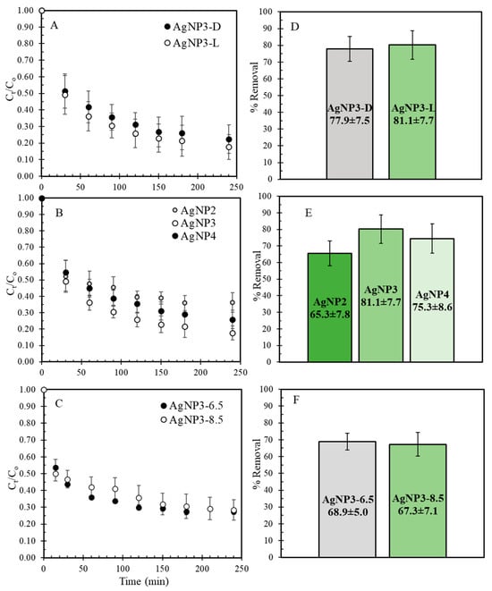 The MB discoloration curves and comparison in percent removal for (A,D) AgNPs synthesized at 3mM AgNO3 and a pH of the extract of 4.5 in the dark and under green light; (B,E) for AgNPs synthesized at 2, 3, and 4 mM AgNO3 and a pH of the extract of 4.5 under green light; (C,F) for AgNPs synthesized at 3 mM AgNO3 and pH of the extract of 6.5 and 8.5 under green light.
