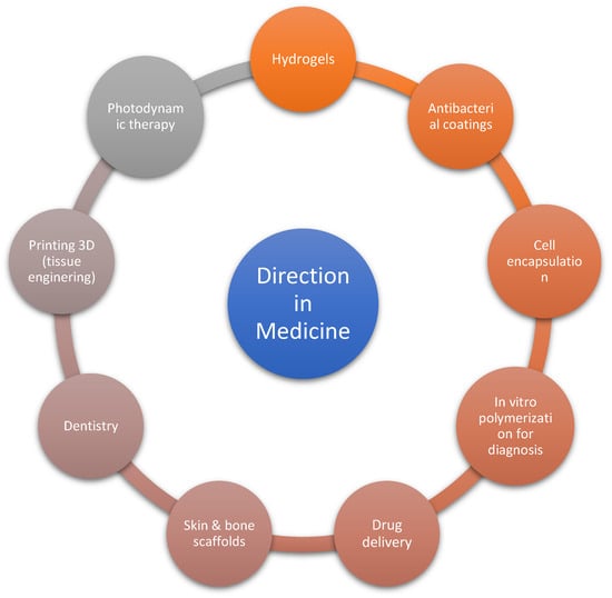 The main directions of use of photopolymerization are coatings, 3D printing, adhesives, electronics, optics, pharmacy and medicine [18]. In medicine, the use of photopolymerization and photoinitiators is focused on refining several elements. These elements are presented in Figure 1.