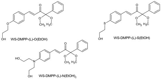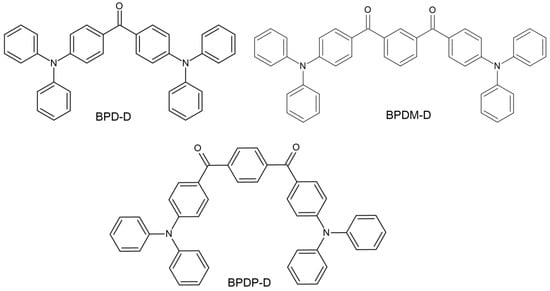 - BP—A shift in the absorption spectrum towards longer wavelengths was started by Huang’s team. Three new compounds were synthesized based on the BP skeleton. Its chemical structure is presented in Figure 6. The experiment obtained compounds with good solubility in organic solvents and the TMPTMA (trimethylolpropane trimethacrylate) monomer. The modification of the chemical structures of benzophenone resulted in a shift of the absorption spectrum to approximately 380 nm and an increase in the molar extinction coefficient. The effectiveness of new photoinitiators in combination with the abovementioned monomer in the photopolymerization process was also demonstrated. This opens up new possibilities for BP modification [57].