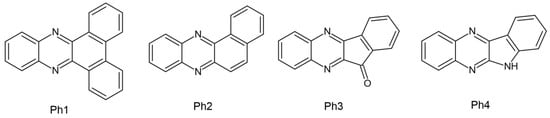 Chemical structure of photoinitiators based on quinoxaline skeleton [30]. (Ph1) dibenzo[a,c]phenazine, (Ph2) benzo[a]phenazine, (Ph3) 11H-indeno [1,2-b]quinoxalin-11-one, (Ph4) 6H-indolo[2,3-b]quinoxaline.