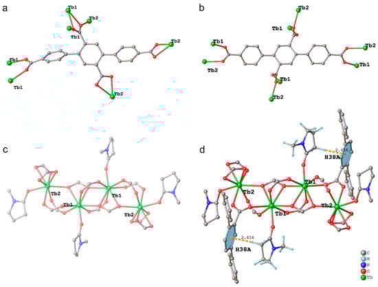 Views of (a) μ7 and (b) μ8 coordination modes of ligand. (c) View of Tb4(COO)12·4NMP cluster. (d) C-H···π hydrogen bond within crystal structure of TbL.