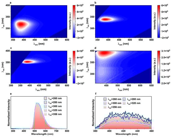 Three-dimensional PL spectra of (a) 10−4 M, (b) 10−3 M, and (c) 10−2 M H4L solutions and (d) H4L in solid state. Phosphorescence spectra of H4L (e) in solid state at 77 K and (f) in range of 380–460 nm.