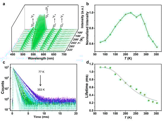 (a) Temperature-dependent PL spectra and (b) integrated intensities of 5D4→7F5 transition of TbL. (c) Temperature-dependent 5D4 decay curves. (d) Experimental temperature-dependent 5D4 lifetime values (green scatters) and the fitted curve (grey line, R2 = 0.98) of TbL.