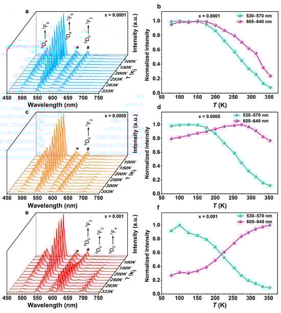 (a) Temperature-dependent PL spectra and (b) integrated areas of ITb and IEu of EuxTb1−xL (x = 0.0001) upon excitation at 345 nm. (c) Temperature-dependent PL spectra and (d) integrated areas of ITb and IEu of EuxTb1−xL (x = 0.0005) upon excitation at 345 nm. (e) Temperature-dependent PL spectra and (f) integrated areas of ITb and IEu of EuxTb1−xL (x = 0.001) upon excitation at 345 nm. Asterisk represents the overlap between Eu3+ 5D0→7F2 and Tb3+ 5D4→7F3 transitions, and pound sign represents that between Eu3+ 5D0→7F0,1 and Tb3+ 5D4→7F4 transitions.
