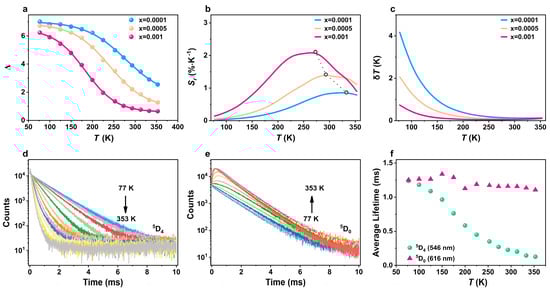 (a) Thermometric parameters, (b) relative thermal sensitivities, and (c) temperature uncertainties of EuxTb1−xL samples within the temperature range of 77–353 K. Temperature-dependent PL decay curves of (d) Tb3+ and (e) Eu3+ and (f) temperature-dependent PL lifetimes for the sample with x = 0.001 in the 77–353 K range.