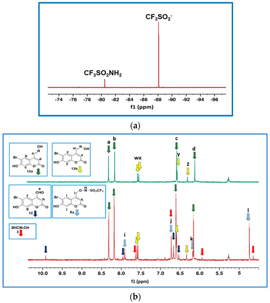 Figure 1a shows the 19F NMR spectrum obtained upon completely photolyzing 8a in anaerobic 80:20 v/v CD3CN:phosphate buffer (pH 7.0, 0.1 M). Upon photolysis, 8a released CF3SO2− (94%, −88.1 ppm); that is, almost stoichiometric release of (H)NO. In addition, a small amount of CF3SO2NH2 (6%, −80.5 ppm) was generated via competing photoinduced O-N cleavage of 8a (Scheme 2, Pathway 3). The chemical shifts of both fluorinated photoproducts were confirmed using authentic samples of these compounds. No formation and subsequent decomposition of CF3SO2N(H)O(H) was observed, in line with results found on related systems [22,23,24]. If CF3SO2N(H)O(H) was an intermediate, we would have expected to observe it in the 19F NMR spectra during data collection since the half-life (t1/2) for decomposition of this compound is ~13 min in pH 7.4 buffer solution [41]. Hence, CF3SO2− can be presumed to form exclusively via Pathway 1, Scheme 2.
