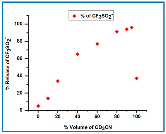 The effect of the solvent composition on the photoproducts obtained from 8a is shown in Figure 2. The percentage of the desired pathway (Pathway 1, Scheme 2) increases as the volume percentage of CD3CN in the CD3CN/phosphate buffer (0.10 M, pH 7.0) increases, with 97% CF3SO2− (and (H)NO) generated in 95:5 v/v CD3CN:phosphate buffer. However, in pure CD3CN only ~36% CF3SO2− is produced. A dramatic decrease in the percentage of the (H)NO-generating pathway in pure CD3CN compared to solvent mixtures of CD3CN and phosphate buffer (pH 7.0) was also observed for the (6-hydroxylnapthylen-2-yl)methyl-ON(H)SO2CF3 system, with only O-N bond cleavage observed in pure CD3CN [23,24].