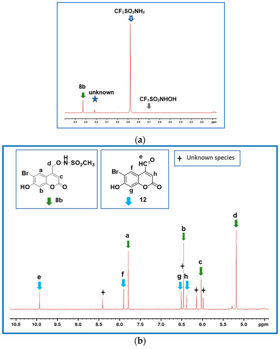 Based on our recent success with the (hydroxynapthalen-2-yl)methyl systems, in this study, a family of photoactivatable (6-bromo-7-hydroxycoumarin-4-yl)methyl-caged N-hydroxysulfonamides (BHCM-ONHSO2R, R = CF3 (8a), CH3 (8b) and (2-SO2Me)Ph (8c)) were targeted. The rationale for choosing the (6-bromo-7-hydroxycoumarin-4-yl)methyl (BHCM) chromophore is that, unlike with our previously studied systems, visible light can be used to trigger photodegradation. Furthermore, rapid heterolytic bond cleavage of the excited parent molecule is expected (~109 s−1) [27] to generate (H)NO and a carbocation intermediate. The BHCM chromophore also exhibits good aqueous solubility, in addition to a strong absorption extending into the visible range [28,29,30,31].