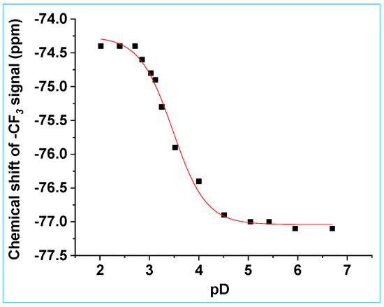 Chemical shift of the CF3 peak of 8a versus pD. Data were fitted to Equation (1), giving pKa = 3.42 ± 0.02, δHA = −74.7 ± 0.1 ppm and δA− = −77.0 ± 0.1 ppm.