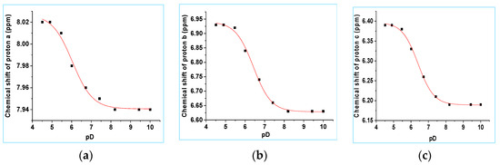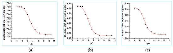 (a) Chemical shifts of protons a, b and c vs. pD. The data were fitted to Equation (1). (a) Proton a: pKa = 6.28 ± 0.01, δHA = 8.02 ± 0.01 ppm and δA− = 7.94 ± 0.01 ppm. (b) Proton b: pKa = 6.42 ± 0.03, δHA = 6.94 ± 0.01 ppm and δA− = 6.63 ± 0.01 ppm. (c) Proton c: pKa = 6.38 ± 0.03, δHA = 6.39 ± 0.01 ppm and δA− = 6.18 ± 0.01 ppm.