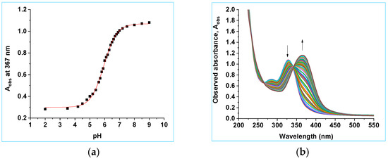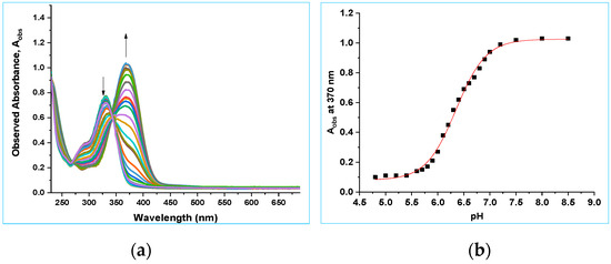 The pKa value of 8b was also investigated by UV–vis spectroscopy. A UV–vis spectroscopic titration experiment for 8b was carried out to determine the pKa value of the O(H) substituent. A UV–vis spectrophotometric titration of 8b (3.1 × 10−5 M, in 8:92 v/v CH3CN:H2O, 30 mL) was conducted using the same flow set up used for 8a (Figure 10a). The absorbance at 370 nm was plotted as a function of pH. Data were fitted to Equation (2), giving pKa = 6.47 ± 0.03 (8:92 v/v CH3CN:H2O, Figure 10b). The pKa for the O(H) proton from the NMR spectroscopic studies reported above was 6.40 ± 0.03 (in D2O with 8% v/v CH3CN, I = 1.0 M, CF3SO3Na). This is once again consistent with the pKa values in H2O being typically 0.05–0.6 lower than in D2O [53,54,55].