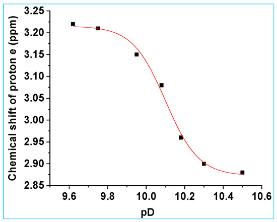 1H NMR chemical shift (ppm) for the CH3 protons (protons e) of 8b as a function of pD, in D2O with 8% v/v CH3CN, I = 1.0 M, CF3SO3Na. Data were fitted to Equation (1), giving pKa = 10.11 ± 0.03, δHA = 3.22 ± 0.01 ppm and δA− = 2.87 ± 0.01 ppm.
