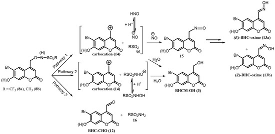 It is well established that (coumarin-4-yl)methyl-caged derivatives incorporating good leaving groups on the benzylic carbon undergo photolysis to eliminate the leaving group and generate a solvent-caged (coumarin-4-yl)methyl carbocation intermediate [28,30,32,37,38,39,40]. Previous studies of photocaged N-hydroxysulfonamides have shown that heterolytic O-N bond cleavage can also occur in addition to C-O and concomitant C-O/N-S bond cleavage [22,23]. Possible pathways for photodecomposition of 8a and 8b are presented in Scheme 2. In Pathway 1, concerted C-O/N-S bond cleavage occurs to generate a solvent-caged reactive carbocation intermediate 14, NO− and the corresponding sulfinate. Previously, (E)-6-hydroxynaphthalene-2-aldoxime ((E)-6,2-HNM-oxime) was observed as a photoproduct upon the irradiation of (6-hydroxynaphthalen-2-yl)methyl (6,2-HNM)-caged trifluoromethanesulfonyl hydroxamic acid, from the reaction of the carbocation intermediate with (H)NO [24]. We speculate here that analogous rapid trapping of the carbocation intermediate 14 by the nucleophilic (H)NO in the solvent cage leads to the formation of nitroso intermediate 15, as shown in Scheme 2, before diffusion of (H)NO from the solvent cage can occur. This species then tautomerizes to (E)-BHC-oxime 13a which photoisomerizes to give (Z)-BHC-oxime 13b. The reaction of the carbocation intermediate 14 with solvent H2O would instead generate 4-hydroxymethylcoumarin diol 3, BHCM-OH [28,30,32,37,38,39,40]. Competing C-O bond cleavage would generate the same carbocation intermediate and the parent anion of the N-hydroxysulfonamide, RSO2NHO− (R = CF3 or CH3), Pathway 2. Again, the carbocation could react with H2O to generate 3. O-N bond cleavage is also possible, with the generation of the corresponding sulfonamide 16 and (6-bromo-7-hydroxycoumarin-4-yl)methyl aldehyde (BHC-CHO) (12), Pathway 3.