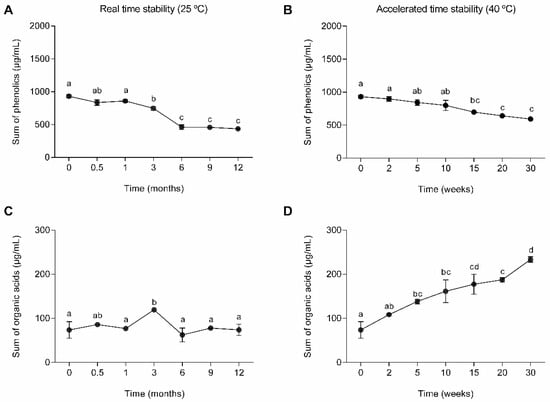 Sum of phenolics and organic acids (mean ± SD) (n = 3) in real-time (25 °C, 65% RH) and accelerated (40 °C, 65% RH) stability conditions. Different letters indicate statistical differences (p < 0.05) along storage. (A) Sum of phenolics along 12 days in real-time (25 °C, 65% RH) stability conditions. (B) Sum of phenolics along 12 days in accelerated (40 °C, 65% RH) stability conditions. (C) Sum of organic acids along 12 days in real-time (25 °C, 65% RH) stability conditions. (D) Sum of organic acids along 12 days in accelerated (40 °C, 65% RH) stability conditions.